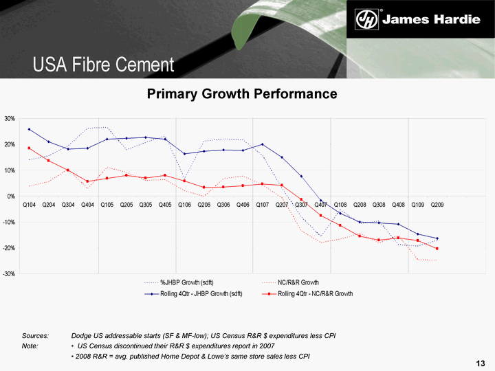 | Primary Growth Performance Sources: Dodge US addressable starts (SF & MF-low); US Census R&R $ expenditures less CPI Note: US Census discontinued their R&R $ expenditures report in 2007 2008 R&R = avg. published Home Depot & Lowe's same store sales less CPI USA Fibre Cement |