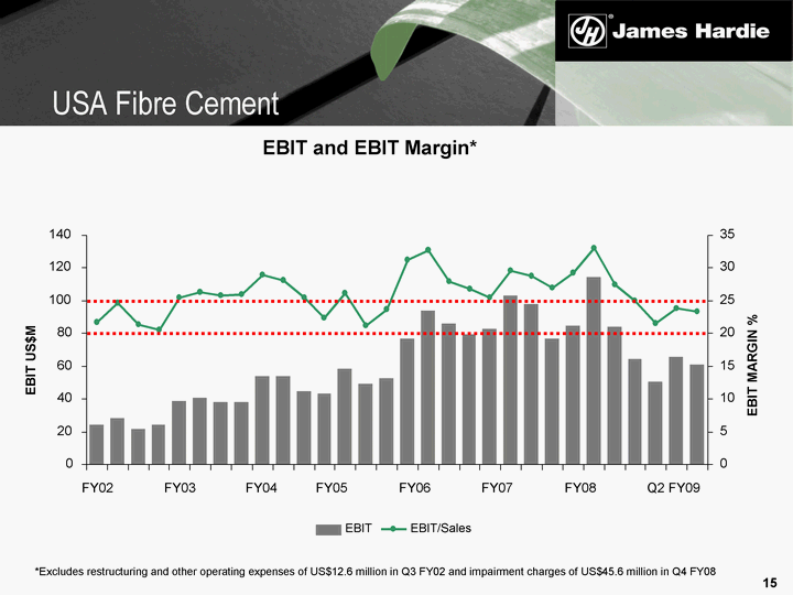 | *Excludes restructuring and other operating expenses of US$12.6 million in Q3 FY02 and impairment charges of US$45.6 million in Q4 FY08 EBIT and EBIT Margin* 0 20 40 60 80 100 120 140 FY02 FY03 FY04 FY05 FY06 FY07 FY08 Q2 FY09 EBIT US$M 0 5 10 15 20 25 30 35 EBIT MARGIN % EBIT EBIT/Sales USA Fibre Cement |
