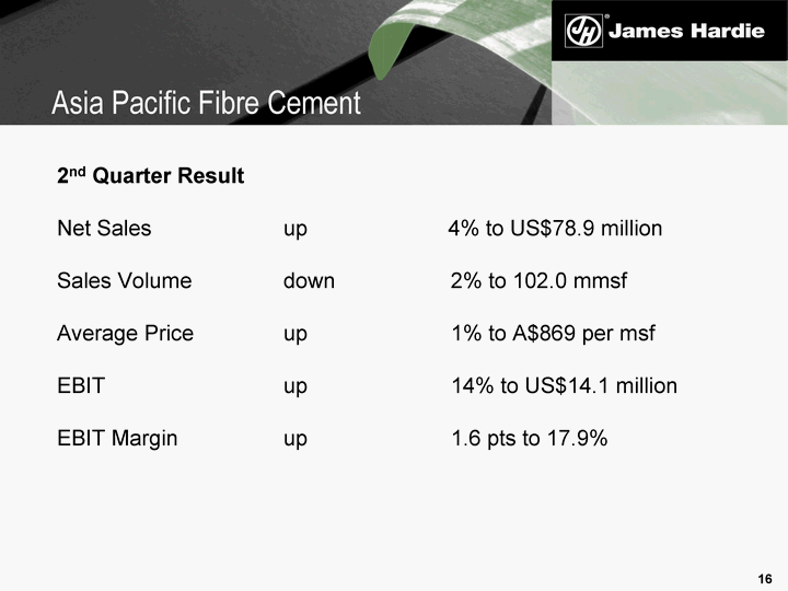 | 2nd Quarter Result Net Sales up 4% to US$78.9 million Sales Volume down 2% to 102.0 mmsf Average Price up 1% to A$869 per msf EBIT up 14% to US$14.1 million EBIT Margin up 1.6 pts to 17.9% Asia Pacific Fibre Cement |