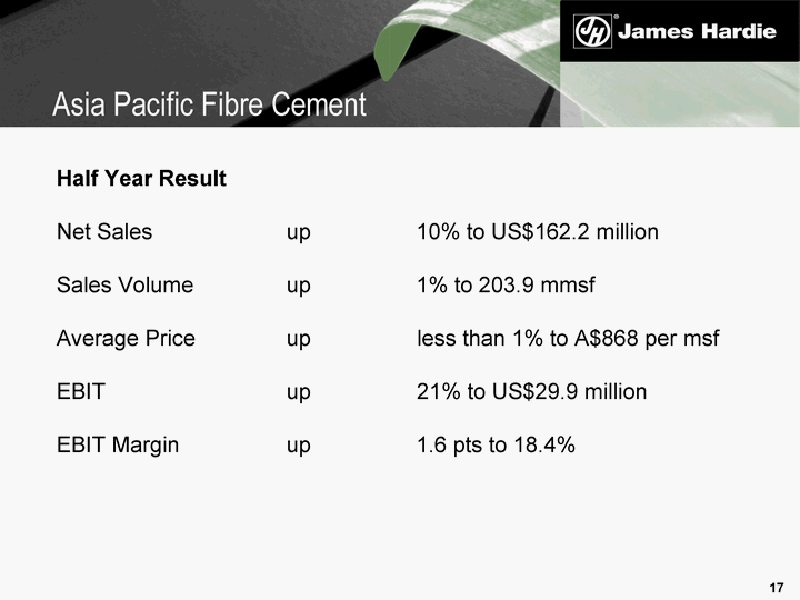 | Half Year Result Net Sales up 10% to US$162.2 million Sales Volume up 1% to 203.9 mmsf Average Price up less than 1% to A$868 per msf EBIT up 21% to US$29.9 million EBIT Margin up 1.6 pts to 18.4% Asia Pacific Fibre Cement |