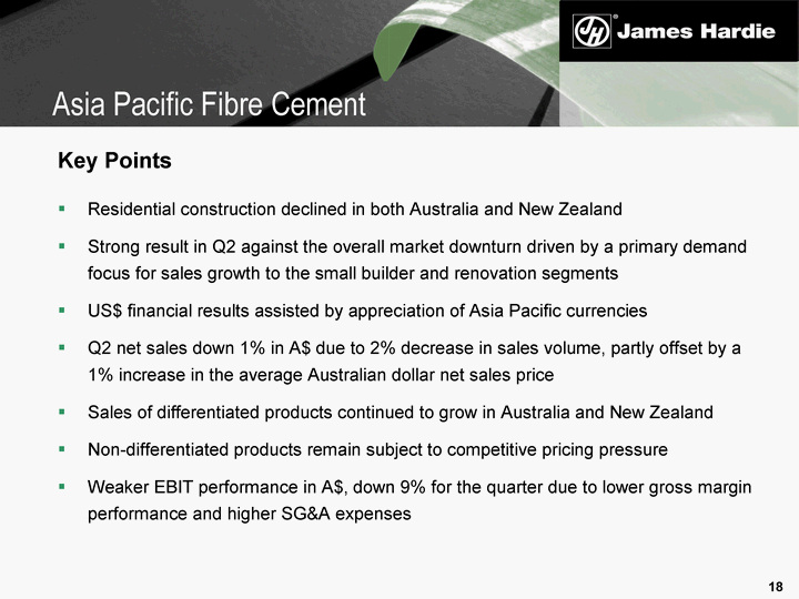 | Key Points Residential construction declined in both Australia and New Zealand Strong result in Q2 against the overall market downturn driven by a primary demand focus for sales growth to the small builder and renovation segments US$ financial results assisted by appreciation of Asia Pacific currencies Q2 net sales down 1% in A$ due to 2% decrease in sales volume, partly offset by a 1% increase in the average Australian dollar net sales price Sales of differentiated products continued to grow in Australia and New Zealand Non-differentiated products remain subject to competitive pricing pressure Weaker EBIT performance in A$, down 9% for the quarter due to lower gross margin performance and higher SG&A expenses Asia Pacific Fibre Cement |