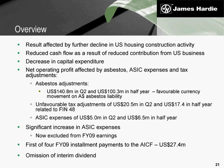 | Result affected by further decline in US housing construction activity Reduced cash flow as a result of reduced contribution from US business Decrease in capital expenditure Net operating profit affected by asbestos, ASIC expenses and tax adjustments: Asbestos adjustments: US$140.8m in Q2 and US$100.3m in half year - favourable currency movement on A$ asbestos liability Unfavourable tax adjustments of US$20.5m in Q2 and US$17.4 in half year related to FIN 48 ASIC expenses of US$5.0m in Q2 and US$6.5m in half year Significant increase in ASIC expenses Now excluded from FY09 earnings First of four FY09 installment payments to the AICF - US$27.4m Omission of interim dividend Overview |