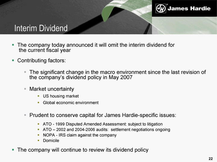 | The company today announced it will omit the interim dividend for the current fiscal year Contributing factors: The significant change in the macro environment since the last revision of the company's dividend policy in May 2007 Market uncertainty US housing market Global economic environment Prudent to conserve capital for James Hardie-specific issues: ATO - 1999 Disputed Amended Assessment: subject to litigation ATO - 2002 and 2004-2006 audits: settlement negotiations ongoing NOPA - IRS claim against the company Domicile The company will continue to review its dividend policy Interim Dividend |