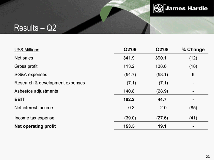 | US$ Millions Q2'09 Q2'08 % Change Net sales 341.9 390.1 (12) Gross profit 113.2 138.8 (18) SG&A expenses (54.7) (58.1) 6 Research & development expenses (7.1) (7.1) - Asbestos adjustments 140.8 (28.9) - EBIT 192.2 44.7 - Net interest income 0.3 2.0 (85) Income tax expense (39.0) (27.6) (41) Net operating profit 153.5 19.1 - Results - Q2 |