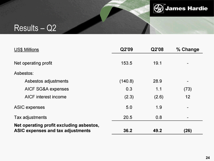 | US$ Millions Q2'09 Q2'08 % Change Net operating profit 153.5 19.1 - Asbestos: Asbestos adjustments (140.8) 28.9 - AICF SG&A expenses 0.3 1.1 (73) AICF interest income (2.3) (2.6) 12 ASIC expenses 5.0 1.9 - Tax adjustments 20.5 0.8 - Net operating profit excluding asbestos, ASIC expenses and tax adjustments 36.2 49.2 (26) Results - Q2 |