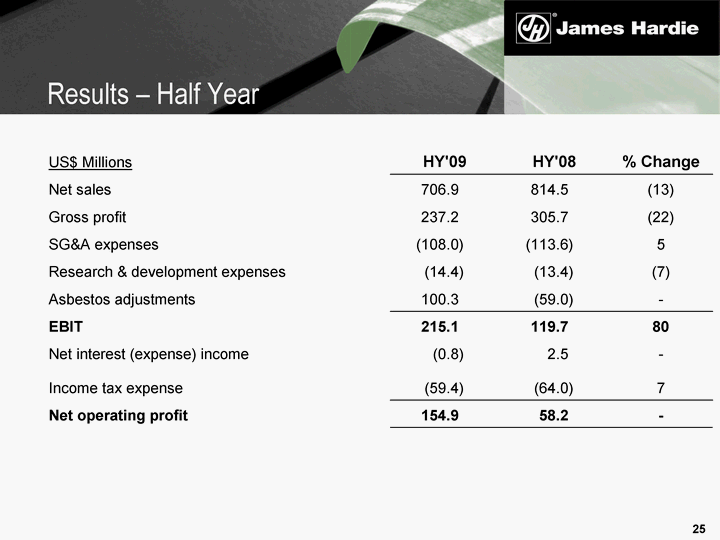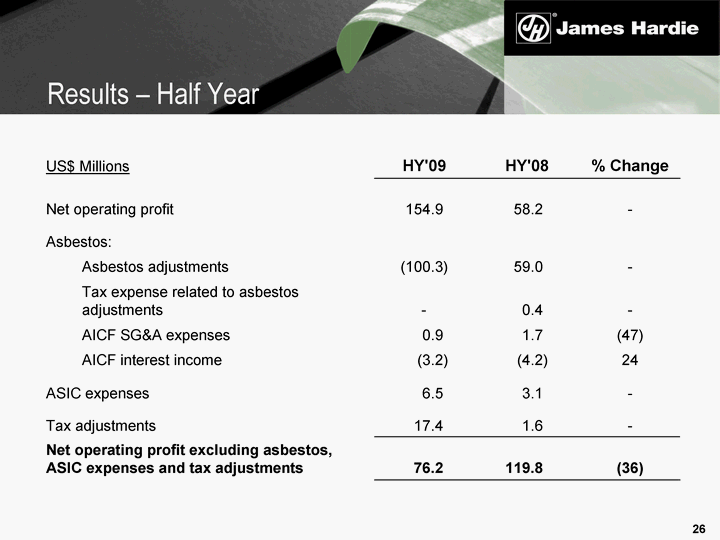 | US$ Millions HY'09 HY'08 % Change Net operating profit 154.9 58.2 - Asbestos: Asbestos adjustments (100.3) 59.0 - Tax expense related to asbestos adjustments - 0.4 - AICF SG&A expenses 0.9 1.7 (47) AICF interest income (3.2) (4.2) 24 ASIC expenses 6.5 3.1 - Tax adjustments 17.4 1.6 - Net operating profit excluding asbestos, ASIC expenses and tax adjustments 76.2 119.8 (36) Results - Half Year |