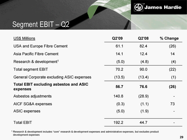 | US$ Millions Q2'09 Q2'08 % Change USA and Europe Fibre Cement 61.1 82.4 (26) Asia Pacific Fibre Cement 14.1 12.4 14 Research & development1 (5.0) (4.8) (4) Total segment EBIT 70.2 90.0 (22) General Corporate excluding ASIC expenses (13.5) (13.4) (1) Total EBIT excluding asbestos and ASIC expenses 56.7 76.6 (26) Asbestos adjustments 140.8 (28.9) - AICF SG&A expenses (0.3) (1.1) 73 ASIC expenses (5.0) (1.9) - Total EBIT 192.2 44.7 - 1 Research & development includes "core" research & development expenses and administrative expenses, but excludes product development expenses Segment EBIT - Q2 |