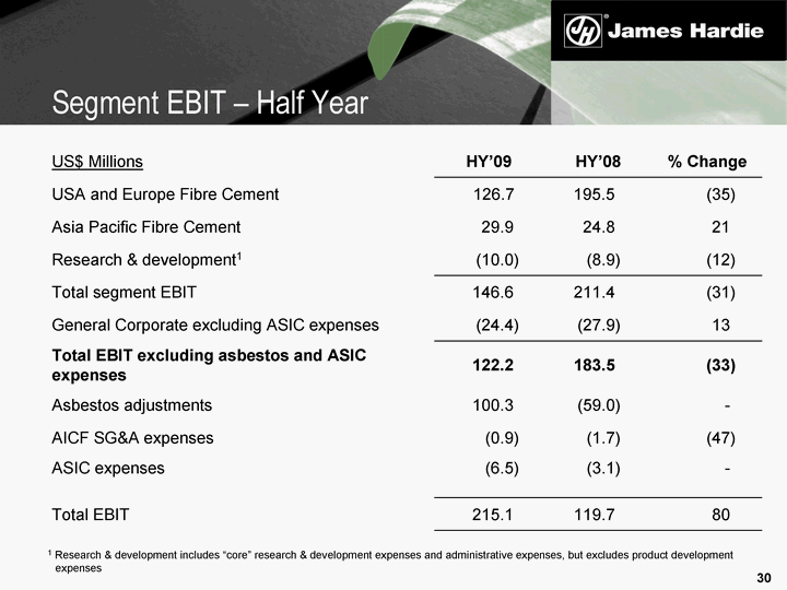 | US$ Millions HY'09 HY'08 % Change USA and Europe Fibre Cement 126.7 195.5 (35) Asia Pacific Fibre Cement 29.9 24.8 21 Research & development1 (10.0) (8.9) (12) Total segment EBIT 146.6 211.4 (31) General Corporate excluding ASIC expenses (24.4) (27.9) 13 Total EBIT excluding asbestos and ASIC expenses 122.2 183.5 (33) Asbestos adjustments 100.3 (59.0) - AICF SG&A expenses (0.9) (1.7) (47) ASIC expenses (6.5) (3.1) - Total EBIT 215.1 119.7 80 1 Research & development includes "core" research & development expenses and administrative expenses, but excludes product development expenses Segment EBIT - Half Year |