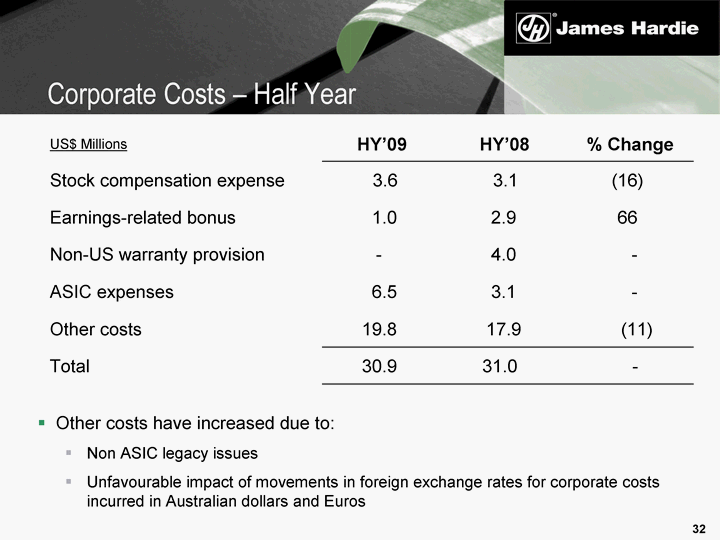 | US$ Millions HY'09 HY'08 % Change Stock compensation expense 3.6 3.1 (16) Earnings-related bonus 1.0 2.9 66 Non-US warranty provision - 4.0 - ASIC expenses 6.5 3.1 - Other costs 19.8 17.9 (11) Total 30.9 31.0 - Other costs have increased due to: Non ASIC legacy issues Unfavourable impact of movements in foreign exchange rates for corporate costs incurred in Australian dollars and Euros Corporate Costs - Half Year |