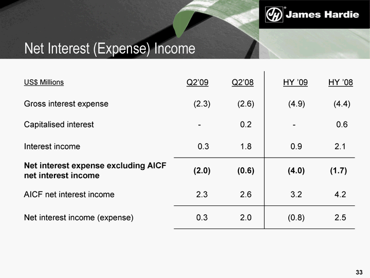 | US$ Millions Q2'09 Q2'08 HY '09 HY '08 Gross interest expense (2.3) (2.6) (4.9) (4.4) Capitalised interest - 0.2 - 0.6 Interest income 0.3 1.8 0.9 2.1 Net interest expense excluding AICF net interest income (2.0) (0.6) (4.0) (1.7) AICF net interest income 2.3 2.6 3.2 4.2 Net interest income (expense) 0.3 2.0 (0.8) 2.5 Net Interest (Expense) Income |