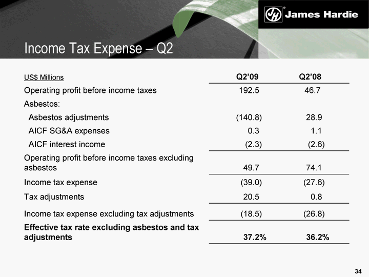 | US$ Millions US$ Millions Q2'09 Q2'08 Operating profit before income taxes Operating profit before income taxes 192.5 46.7 Asbestos: Asbestos: Asbestos adjustments Asbestos adjustments (140.8) 28.9 AICF SG&A expenses AICF SG&A expenses 0.3 1.1 AICF interest income AICF interest income (2.3) (2.6) Operating profit before income taxes excluding asbestos Operating profit before income taxes excluding asbestos 49.7 74.1 Income tax expense Income tax expense (39.0) (27.6) Tax adjustments Tax adjustments 20.5 0.8 Income tax expense excluding tax adjustments Income tax expense excluding tax adjustments (18.5) (26.8) Effective tax rate excluding asbestos and tax adjustments Effective tax rate excluding asbestos and tax adjustments 37.2% 36.2% Income Tax Expense - Q2 |