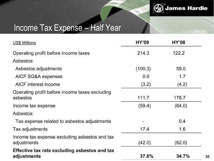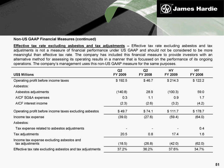 | Non-US GAAP Financial Measures (continued) Effective tax rate excluding asbestos and tax adjustments - Effective tax rate excluding asbestos and tax adjustments is not a measure of financial performance under US GAAP and should not be considered to be more meaningful than effective tax rate. The company has included this financial measure to provide investors with an alternative method for assessing its operating results in a manner that is focussed on the performance of its ongoing operations. The company's management uses this non-US GAAP measure for the same purposes. US$ Millions Q2 FY 2009 Q2 FY 2008 HY FY 2009 HY FY 2008 Operating profit before income taxes $ 192.5 $ 46.7 $ 214.3 $ 122.2 Asbestos: Asbestos adjustments (140.8) 28.9 (100.3) 59.0 AICF SG&A expenses 0.3 1.1 0.9 1.7 AICF interest income (2.3) (2.6) (3.2) (4.2) Operating profit before income taxes excluding asbestos $ 49.7 $ 74.1 $ 111.7 $ 178.7 Income tax expense (39.0) (27.6) (59.4) (64.0) Asbestos: Tax expense related to asbestos adjustments - - - 0.4 Tax adjustments 20.5 0.8 17.4 1.6 Income tax expense excluding asbestos and tax adjustments (18.5) (26.8) (42.0) (62.0) Effective tax rate excluding asbestos and tax adjustments 37.2% 36.2% 37.6% 34.7% |