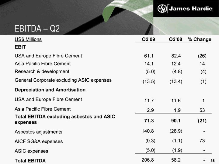 | US$ Millions Q2'09 Q2'08 % Change EBIT USA and Europe Fibre Cement 61.1 82.4 (26) Asia Pacific Fibre Cement 14.1 12.4 14 Research & development (5.0) (4.8) (4) General Corporate excluding ASIC expenses (13.5) (13.4) (1) Depreciation and Amortisation USA and Europe Fibre Cement 11.7 11.6 1 Asia Pacific Fibre Cement 2.9 1.9 53 Total EBITDA excluding asbestos and ASIC expenses 71.3 90.1 (21) Asbestos adjustments 140.8 (28.9) - AICF SG&A expenses (0.3) (1.1) 73 ASIC expenses (5.0) (1.9) - Total EBITDA 206.8 58.2 - EBITDA - Q2 |