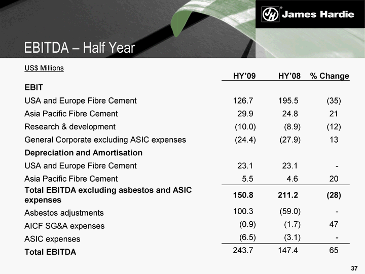 | US$ Millions HY'09 HY'08 % Change EBIT USA and Europe Fibre Cement 126.7 195.5 (35) Asia Pacific Fibre Cement 29.9 24.8 21 Research & development (10.0) (8.9) (12) General Corporate excluding ASIC expenses (24.4) (27.9) 13 Depreciation and Amortisation USA and Europe Fibre Cement 23.1 23.1 - Asia Pacific Fibre Cement 5.5 4.6 20 Total EBITDA excluding asbestos and ASIC expenses 150.8 211.2 (28) Asbestos adjustments 100.3 (59.0) - AICF SG&A expenses (0.9) (1.7) 47 ASIC expenses (6.5) (3.1) - Total EBITDA 243.7 147.4 65 EBITDA - Half Year |