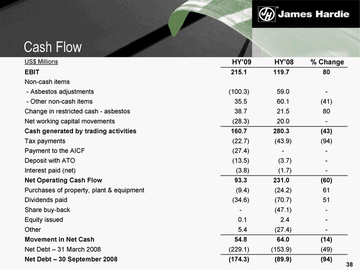 | US$ Millions HY'09 HY'08 % Change EBIT 215.1 119.7 80 Non-cash items - Asbestos adjustments (100.3) 59.0 - - Other non-cash items 35.5 60.1 (41) Change in restricted cash - asbestos 38.7 21.5 80 Net working capital movements (28.3) 20.0 - Cash generated by trading activities 160.7 280.3 (43) Tax payments (22.7) (43.9) (94) Payment to the AICF (27.4) - - Deposit with ATO (13.5) (3.7) - Interest paid (net) (3.8) (1.7) - Net Operating Cash Flow 93.3 231.0 (60) Purchases of property, plant & equipment (9.4) (24.2) 61 Dividends paid (34.6) (70.7) 51 Share buy-back - (47.1) - Equity issued 0.1 2.4 - Other 5.4 (27.4) - Movement in Net Cash 54.8 64.0 (14) Net Debt - 31 March 2008 (229.1) (153.9) (49) Net Debt - 30 September 2008 (174.3) (89.9) (94) Cash Flow |