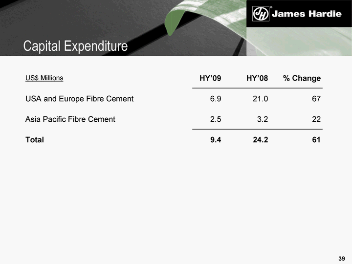 | US$ Millions HY'09 HY'08 % Change USA and Europe Fibre Cement 6.9 21.0 67 Asia Pacific Fibre Cement 2.5 3.2 22 Total 9.4 24.2 61 Capital Expenditure |