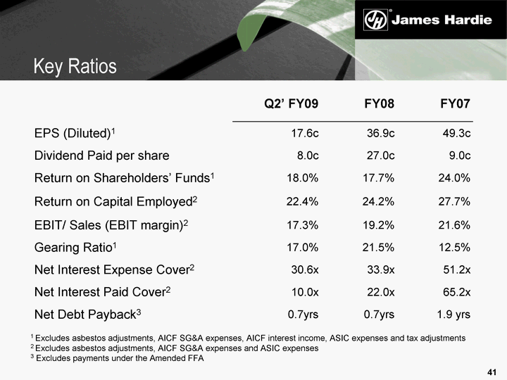 | Q2' FY09 FY08 FY07 EPS (Diluted)1 17.6c 36.9c 49.3c Dividend Paid per share 8.0c 27.0c 9.0c Return on Shareholders' Funds1 18.0% 17.7% 24.0% Return on Capital Employed2 22.4% 24.2% 27.7% EBIT/ Sales (EBIT margin)2 17.3% 19.2% 21.6% Gearing Ratio1 17.0% 21.5% 12.5% Net Interest Expense Cover2 30.6x 33.9x 51.2x Net Interest Paid Cover2 10.0x 22.0x 65.2x Net Debt Payback3 0.7yrs 0.7yrs 1.9 yrs 1 Excludes asbestos adjustments, AICF SG&A expenses, AICF interest income, ASIC expenses and tax adjustments 2 Excludes asbestos adjustments, AICF SG&A expenses and ASIC expenses 3 Excludes payments under the Amended FFA Key Ratios |