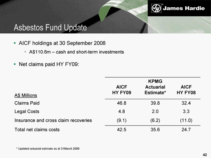 | AICF holdings at 30 September 2008 A$110.6m - cash and short-term investments Net claims paid HY FY09: A$ Millions AICF HY FY09 KPMG Actuarial Estimate* AICF HY FY08 Claims Paid 46.8 39.8 32.4 Legal Costs 4.8 2.0 3.3 Insurance and cross claim recoveries (9.1) (6.2) (11.0) Total net claims costs 42.5 35.6 24.7 * Updated actuarial estimate as at 31March 2008 Asbestos Fund Update |