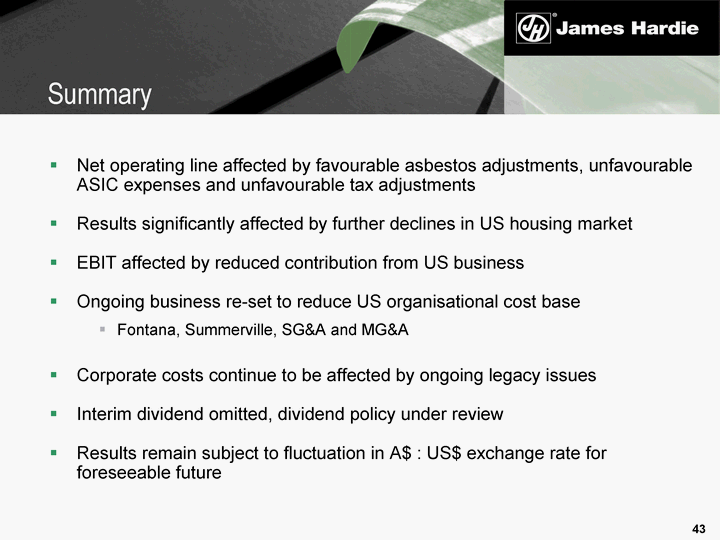 | Net operating line affected by favourable asbestos adjustments, unfavourable ASIC expenses and unfavourable tax adjustments Results significantly affected by further declines in US housing market EBIT affected by reduced contribution from US business Ongoing business re-set to reduce US organisational cost base Fontana, Summerville, SG&A and MG&A Corporate costs continue to be affected by ongoing legacy issues Interim dividend omitted, dividend policy under review Results remain subject to fluctuation in A$ : US$ exchange rate for foreseeable future Summary |