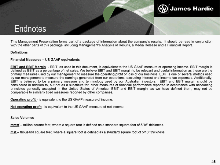 | This Management Presentation forms part of a package of information about the company's results. It should be read in conjunction with the other parts of this package, including Management's Analysis of Results, a Media Release and a Financial Report. Definitions Financial Measures - US GAAP equivalents EBIT and EBIT Margin - EBIT, as used in this document, is equivalent to the US GAAP measure of operating income. EBIT margin is defined as EBIT as a percentage of net sales. We believe EBIT and EBIT margin to be relevant and useful information as these are the primary measures used by our management to measure the operating profit or loss of our business. EBIT is one of several metrics used by our management to measure the earnings generated from our operations, excluding interest and income tax expenses. Additionally, EBIT is believed to be a primary measure and terminology used by our Australian investors. EBIT and EBIT margin should be considered in addition to, but not as a substitute for, other measures of financial performance reported in accordance with accounting principles generally accepted in the United States of America. EBIT and EBIT margin, as we have defined them, may not be comparable to similarly titled measures reported by other companies. Operating profit - is equivalent to the US GAAP measure of income. Net operating profit - is equivalent to the US GAAP measure of net income. Sales Volumes mmsf - million square feet, where a square foot is defined as a standard square foot of 5/16" thickness. msf - thousand square feet, where a square foot is defined as a standard square foot of 5/16" thickness. Endnotes |