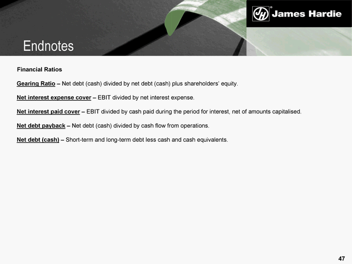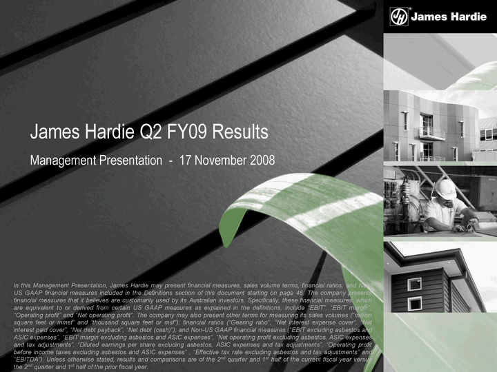 | In this Management Presentation, James Hardie may present financial measures, sales volume terms, financial ratios, and Non- US GAAP financial measures included in the Definitions section of this document starting on page 46. The company presents financial measures that it believes are customarily used by its Australian investors. Specifically, these financial measures, which are equivalent to or derived from certain US GAAP measures as explained in the definitions, include "EBIT", "EBIT margin", "Operating profit" and "Net operating profit". The company may also present other terms for measuring its sales volumes ("million square feet or mmsf" and "thousand square feet or msf"); financial ratios ("Gearing ratio", "Net interest expense cover", "Net interest paid cover", "Net debt payback", "Net debt (cash)"); and Non-US GAAP financial measures ("EBIT excluding asbestos and ASIC expenses", "EBIT margin excluding asbestos and ASIC expenses", "Net operating profit excluding asbestos, ASIC expenses and tax adjustments", "Diluted earnings per share excluding asbestos, ASIC expenses and tax adjustments", "Operating profit before income taxes excluding asbestos and ASIC expenses" , "Effective tax rate excluding asbestos and tax adjustments" and "EBITDA"). Unless otherwise stated, results and comparisons are of the 2nd quarter and 1st half of the current fiscal year versus the 2nd quarter and 1st half of the prior fiscal year. James Hardie Q2 FY09 Results Management Presentation - 17 November 2008 |