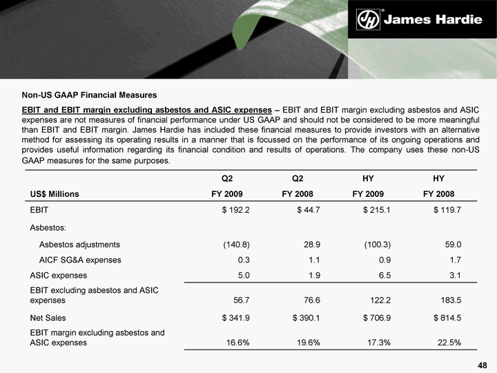 | Non-US GAAP Financial Measures EBIT and EBIT margin excluding asbestos and ASIC expenses - EBIT and EBIT margin excluding asbestos and ASIC expenses are not measures of financial performance under US GAAP and should not be considered to be more meaningful than EBIT and EBIT margin. James Hardie has included these financial measures to provide investors with an alternative method for assessing its operating results in a manner that is focussed on the performance of its ongoing operations and provides useful information regarding its financial condition and results of operations. The company uses these non-US GAAP measures for the same purposes. Q2 Q2 HY HY US$ Millions FY 2009 FY 2008 FY 2009 FY 2008 EBIT $ 192.2 $ 44.7 $ 215.1 $ 119.7 Asbestos: Asbestos adjustments (140.8) 28.9 (100.3) 59.0 AICF SG&A expenses 0.3 1.1 0.9 1.7 ASIC expenses 5.0 1.9 6.5 3.1 EBIT excluding asbestos and ASIC expenses 56.7 76.6 122.2 183.5 Net Sales $ 341.9 $ 390.1 $ 706.9 $ 814.5 EBIT margin excluding asbestos and ASIC expenses 16.6% 19.6% 17.3% 22.5% |