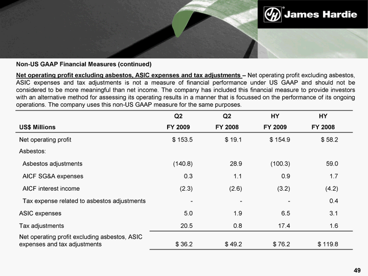 | Non-US GAAP Financial Measures (continued) Net operating profit excluding asbestos, ASIC expenses and tax adjustments - Net operating profit excluding asbestos, ASIC expenses and tax adjustments is not a measure of financial performance under US GAAP and should not be considered to be more meaningful than net income. The company has included this financial measure to provide investors with an alternative method for assessing its operating results in a manner that is focussed on the performance of its ongoing operations. The company uses this non-US GAAP measure for the same purposes. Q2 Q2 HY HY US$ Millions FY 2009 FY 2008 FY 2009 FY 2008 Net operating profit $ 153.5 $ 19.1 $ 154.9 $ 58.2 Asbestos: Asbestos adjustments (140.8) 28.9 (100.3) 59.0 AICF SG&A expenses 0.3 1.1 0.9 1.7 AICF interest income (2.3) (2.6) (3.2) (4.2) Tax expense related to asbestos adjustments - - - 0.4 ASIC expenses 5.0 1.9 6.5 3.1 Tax adjustments 20.5 0.8 17.4 1.6 Net operating profit excluding asbestos, ASIC expenses and tax adjustments $ 36.2 $ 49.2 $ 76.2 $ 119.8 |