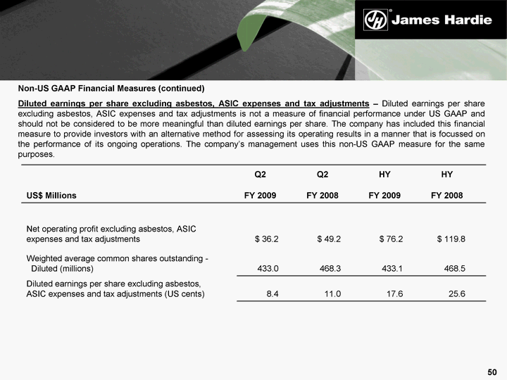 | Non-US GAAP Financial Measures (continued) Diluted earnings per share excluding asbestos, ASIC expenses and tax adjustments - Diluted earnings per share excluding asbestos, ASIC expenses and tax adjustments is not a measure of financial performance under US GAAP and should not be considered to be more meaningful than diluted earnings per share. The company has included this financial measure to provide investors with an alternative method for assessing its operating results in a manner that is focussed on the performance of its ongoing operations. The company's management uses this non-US GAAP measure for the same purposes. Q2 Q2 HY HY US$ Millions FY 2009 FY 2008 FY 2009 FY 2008 Net operating profit excluding asbestos, ASIC expenses and tax adjustments $ 36.2 $ 49.2 $ 76.2 $ 119.8 Weighted average common shares outstanding - Diluted (millions) 433.0 468.3 433.1 468.5 Diluted earnings per share excluding asbestos, ASIC expenses and tax adjustments (US cents) 8.4 11.0 17.6 25.6 |