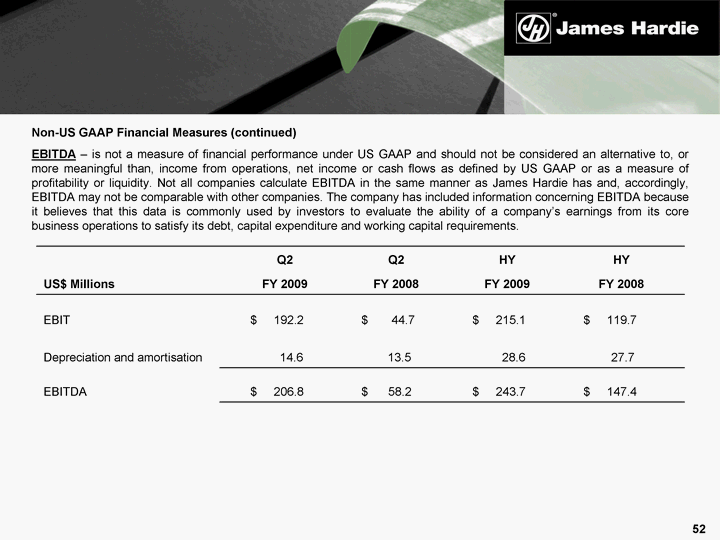 | Non-US GAAP Financial Measures (continued) EBITDA - is not a measure of financial performance under US GAAP and should not be considered an alternative to, or more meaningful than, income from operations, net income or cash flows as defined by US GAAP or as a measure of profitability or liquidity. Not all companies calculate EBITDA in the same manner as James Hardie has and, accordingly, EBITDA may not be comparable with other companies. The company has included information concerning EBITDA because it believes that this data is commonly used by investors to evaluate the ability of a company's earnings from its core business operations to satisfy its debt, capital expenditure and working capital requirements. Q2 Q2 HY HY US$ Millions FY 2009 FY 2008 FY 2009 FY 2008 EBIT $ 192.2 $ 44.7 $ 215.1 $ 119.7 Depreciation and amortisation 14.6 13.5 28.6 27.7 EBITDA $ 206.8 $ 58.2 $ 243.7 $ 147.4 |
