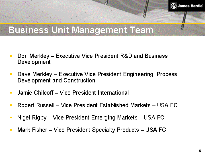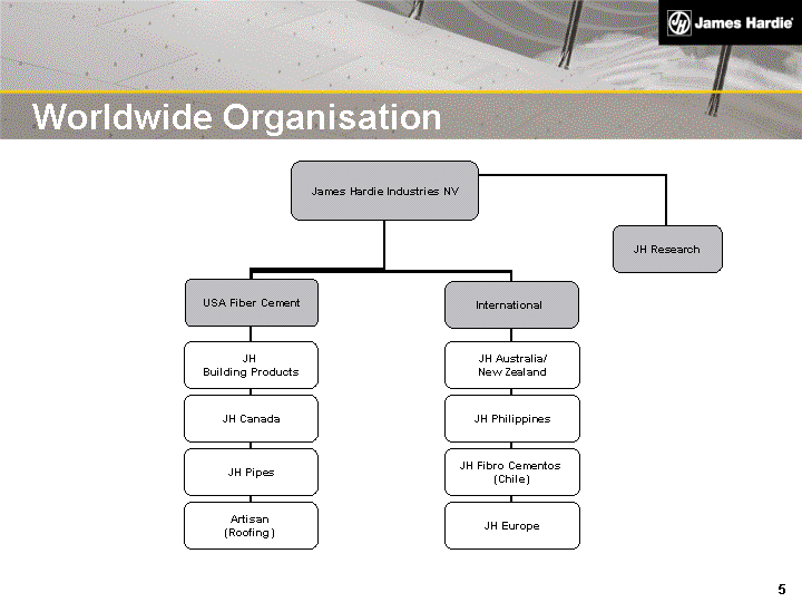 | Disclaimer This presentation contains forward-looking statements. We may from time to time make forward-looking statements in our periodic reports filed with the Securities and Exchange Commission on Forms 20-F and 6-K, in our annual reports to shareholders, in offering circulars and prospectuses, in media releases and other written materials and in oral statements made by our officers, directors or employees to analysts, institutional investors, representatives of the media and others. Examples of such forward-looking statements include: projections of our operating results or financial condition; statements of our plans, objectives or goals, including those relating to competition, acquisitions, dispositions and our products; statements about our future economic performance or that of the United States, Australia or other countries in which we operate; and statements about product or environmental liabilities. Words such as "believe," "anticipate," "plan," "expect," "intend," "target," "estimate," "project," "predict," "forecast," "guideline," "should," "aim" and similar expressions are intended to identify forward-looking statements but are not the exclusive means of identifying such statements. Forward-looking statements involve inherent risks and uncertainties. We caution you that a number of important factors could cause actual results to differ materially from the plans, objectives, expectations, estimates and intentions expressed in such forward-looking statements. These factors include but are not limited to: all matters relating to or arising out of the prior manufacture of asbestos by ABN 60 and certain former subsidiaries; competition and product pricing in the markets in which we operate; general economic and market conditions; compliance with and possible changes in environmental and health and safety laws; the successful transition of new senior management; the success of our research and development efforts; the supply and cost of raw materials; our reliance on a small number of product distributors; the consequences of product failures or defects; exposure to environmental, asbestos or other legal proceedings; risks of conducting business internationally; compliance with and changes in tax laws and treatments; and foreign exchange risks. We caution you that the foregoing list of factors is not exclusive and that other risks and uncertainties may cause actual results to differ materially from those in forward-looking statements. Forward-looking statements speak only as of the date they are made. |