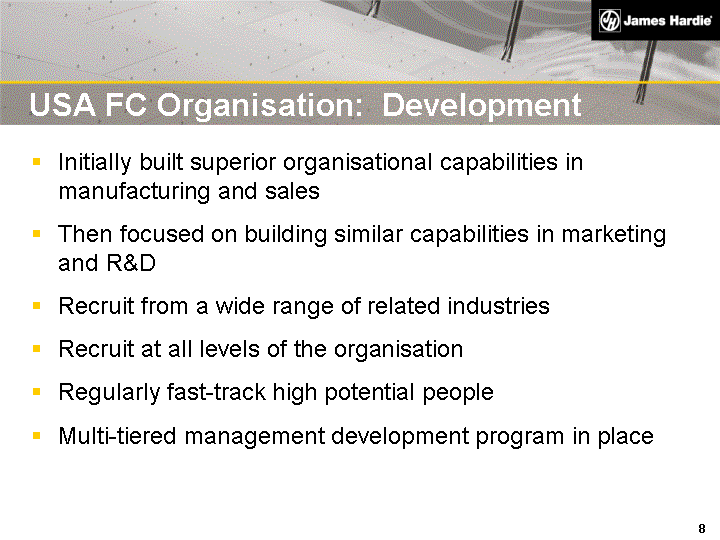 | Initially built superior organisational capabilities in manufacturing and sales Then focused on building similar capabilities in marketing and R&D Recruit from a wide range of related industries Recruit at all levels of the organisation Regularly fast-track high potential people Multi-tiered management development program in place USA FC Organisation: Development |