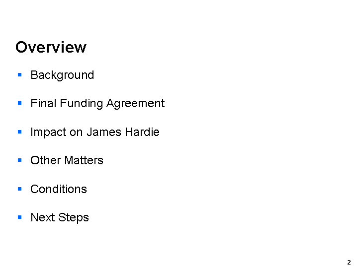| Overview Background Final Funding Agreement Impact on James Hardie Other Matters Conditions Next Steps |