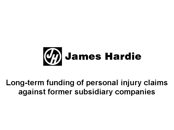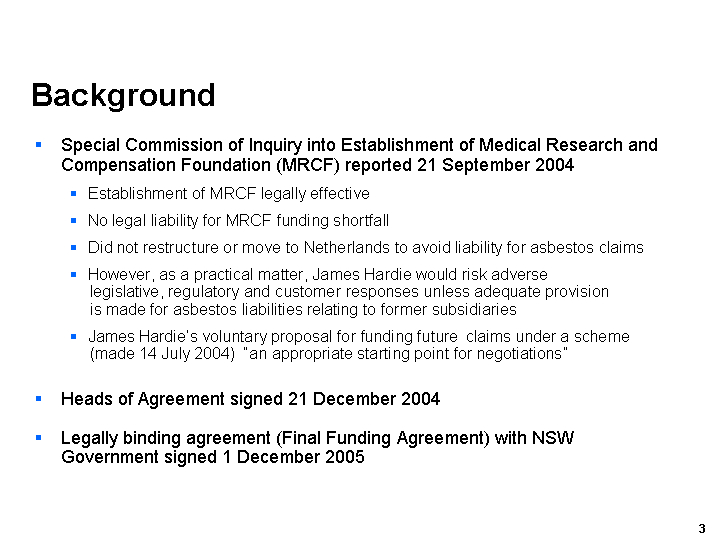 | Background Special Commission of Inquiry into Establishment of Medical Research and Compensation Foundation (MRCF) reported 21 September 2004 Establishment of MRCF legally effective No legal liability for MRCF funding shortfall Did not restructure or move to Netherlands to avoid liability for asbestos claims However, as a practical matter, James Hardie would risk adverse legislative, regulatory and customer responses unless adequate provision is made for asbestos liabilities relating to former subsidiaries James Hardie's voluntary proposal for funding future claims under a scheme (made 14 July 2004) "an appropriate starting point for negotiations" Heads of Agreement signed 21 December 2004 Legally binding agreement (Final Funding Agreement) with NSW Government signed 1 December 2005 |