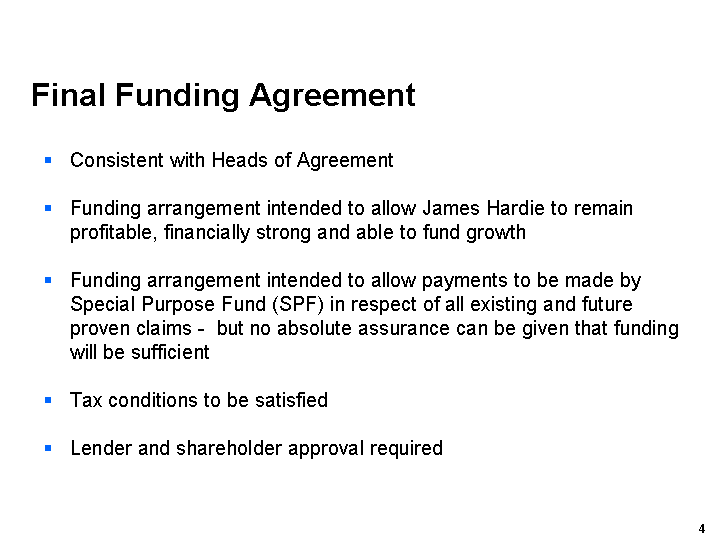 | Final Funding Agreement Consistent with Heads of Agreement Funding arrangement intended to allow James Hardie to remain profitable, financially strong and able to fund growth Funding arrangement intended to allow payments to be made by Special Purpose Fund (SPF) in respect of all existing and future proven claims - but no absolute assurance can be given that funding will be sufficient Tax conditions to be satisfied Lender and shareholder approval required |
