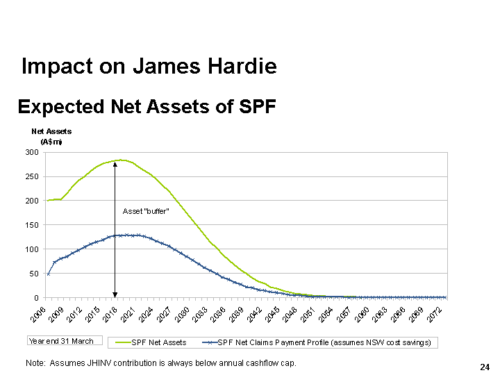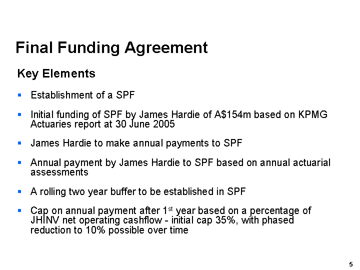 | Final Funding Agreement Key Elements Establishment of a SPF Initial funding of SPF by James Hardie of A$154m based on KPMG Actuaries report at 30 June 2005 James Hardie to make annual payments to SPF Annual payment by James Hardie to SPF based on annual actuarial assessments A rolling two year buffer to be established in SPF Cap on annual payment after 1st year based on a percentage of JHINV net operating cashflow - initial cap 35%, with phased reduction to 10% possible over time |