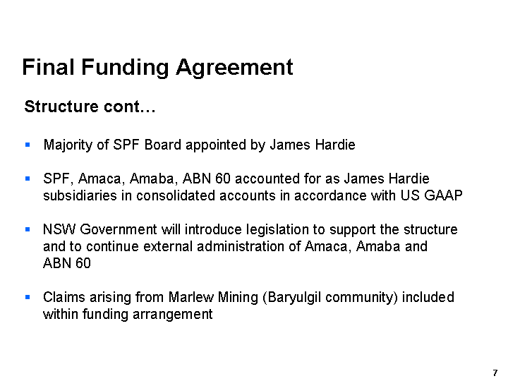| Structure cont... Majority of SPF Board appointed by James Hardie SPF, Amaca, Amaba, ABN 60 accounted for as James Hardie subsidiaries in consolidated accounts in accordance with US GAAP NSW Government will introduce legislation to support the structure and to continue external administration of Amaca, Amaba and ABN 60 Claims arising from Marlew Mining (Baryulgil community) included within funding arrangement Final Funding Agreement |