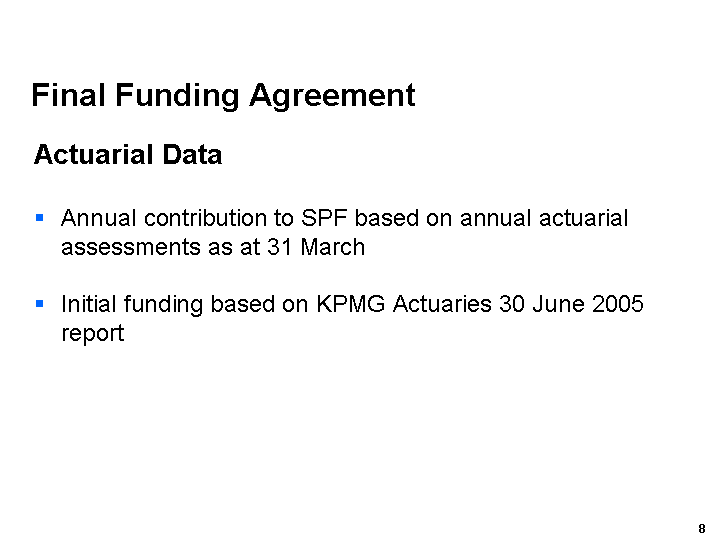 | Final Funding Agreement Actuarial Data Annual contribution to SPF based on annual actuarial assessments as at 31 March Initial funding based on KPMG Actuaries 30 June 2005 report |