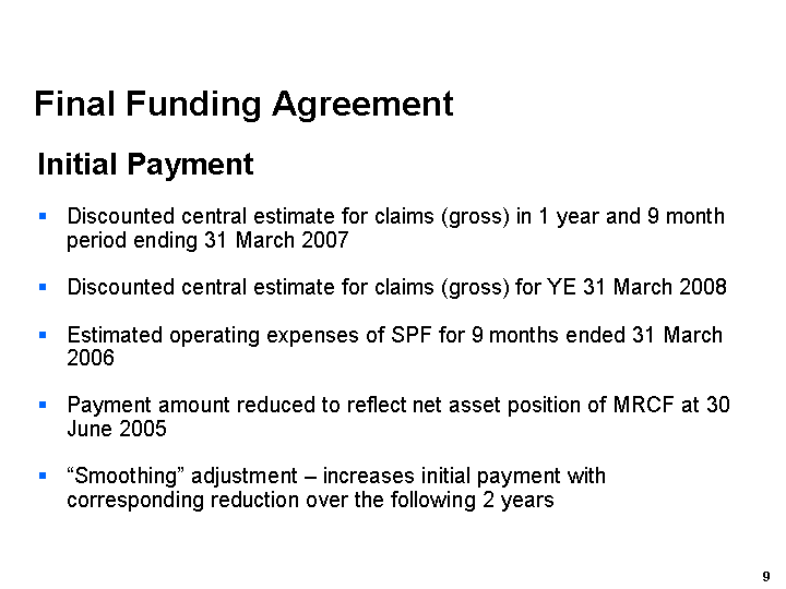 | Final Funding Agreement Initial Payment Discounted central estimate for claims (gross) in 1 year and 9 month period ending 31 March 2007 Discounted central estimate for claims (gross) for YE 31 March 2008 Estimated operating expenses of SPF for 9 months ended 31 March 2006 Payment amount reduced to reflect net asset position of MRCF at 30 June 2005 "Smoothing" adjustment - increases initial payment with corresponding reduction over the following 2 years |