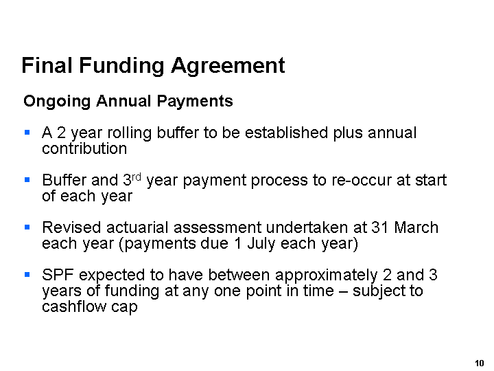 | Final Funding Agreement Ongoing Annual Payments A 2 year rolling buffer to be established plus annual contribution Buffer and 3rd year payment process to re-occur at start of each year Revised actuarial assessment undertaken at 31 March each year (payments due 1 July each year) SPF expected to have between approximately 2 and 3 years of funding at any one point in time - subject to cashflow cap |