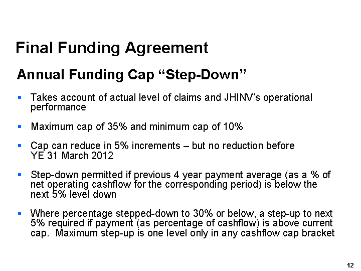 | Final Funding Agreement Annual Funding Cap "Step-Down" Takes account of actual level of claims and JHINV's operational performance Maximum cap of 35% and minimum cap of 10% Cap can reduce in 5% increments - but no reduction before YE 31 March 2012 Step-down permitted if previous 4 year payment average (as a % of net operating cashflow for the corresponding period) is below the next 5% level down Where percentage stepped-down to 30% or below, a step-up to next 5% required if payment (as percentage of cashflow) is above current cap. Maximum step-up is one level only in any cashflow cap bracket |