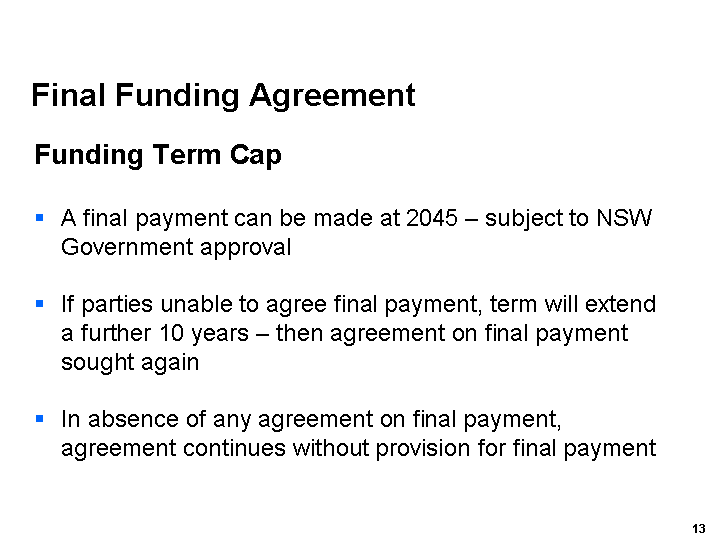 | Final Funding Agreement Funding Term Cap A final payment can be made at 2045 - subject to NSW Government approval If parties unable to agree final payment, term will extend a further 10 years - then agreement on final payment sought again In absence of any agreement on final payment, agreement continues without provision for final payment |