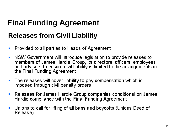 | Final Funding Agreement Releases from Civil Liability Provided to all parties to Heads of Agreement NSW Government will introduce legislation to provide releases to members of James Hardie Group, its directors, officers, employees and advisers to ensure civil liability is limited to the arrangements in the Final Funding Agreement The releases will cover liability to pay compensation which is imposed through civil penalty orders Releases for James Hardie Group companies conditional on James Hardie compliance with the Final Funding Agreement Unions to call for lifting of all bans and boycotts (Unions Deed of Release) |
