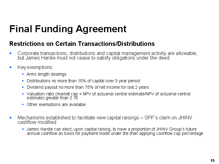 | Final Funding Agreement Restrictions on Certain Transactions/Distributions Corporate transactions, distributions and capital management activity are allowable, but James Hardie must not cease to satisfy obligations under the deed Key exemptions: Arms length dealings Distributions no more than 15% of capital over 3 year period Dividend payout no more than 75% of net income for last 2 years Valuation ratio (market cap + NPV of actuarial central estimate/NPV of actuarial central estimate) greater than 2.75 Other exemptions are available Mechanisms established to facilitate new capital raisings - SPF's claim on JHINV cashflow modified James Hardie can elect, upon capital raising, to have a proportion of JHINV Group's future annual cashflow as basis for payment made under the then applying cashflow cap percentage |