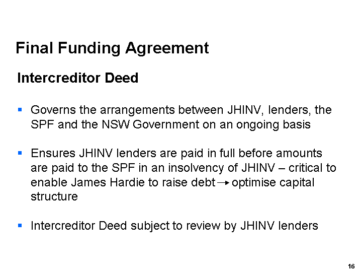 | Intercreditor Deed Governs the arrangements between JHINV, lenders, the SPF and the NSW Government on an ongoing basis Ensures JHINV lenders are paid in full before amounts are paid to the SPF in an insolvency of JHINV - critical to enable James Hardie to raise debt optimise capital structure Intercreditor Deed subject to review by JHINV lenders Final Funding Agreement |