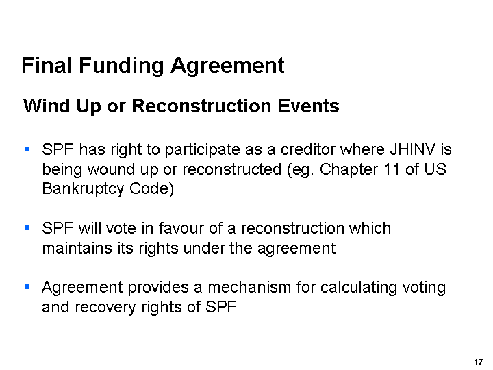 | Final Funding Agreement Wind Up or Reconstruction Events SPF has right to participate as a creditor where JHINV is being wound up or reconstructed (eg. Chapter 11 of US Bankruptcy Code) SPF will vote in favour of a reconstruction which maintains its rights under the agreement Agreement provides a mechanism for calculating voting and recovery rights of SPF |