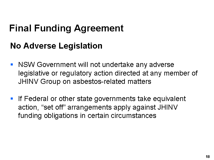| Final Funding Agreement No Adverse Legislation NSW Government will not undertake any adverse legislative or regulatory action directed at any member of JHINV Group on asbestos-related matters If Federal or other state governments take equivalent action, "set off" arrangements apply against JHINV funding obligations in certain circumstances |