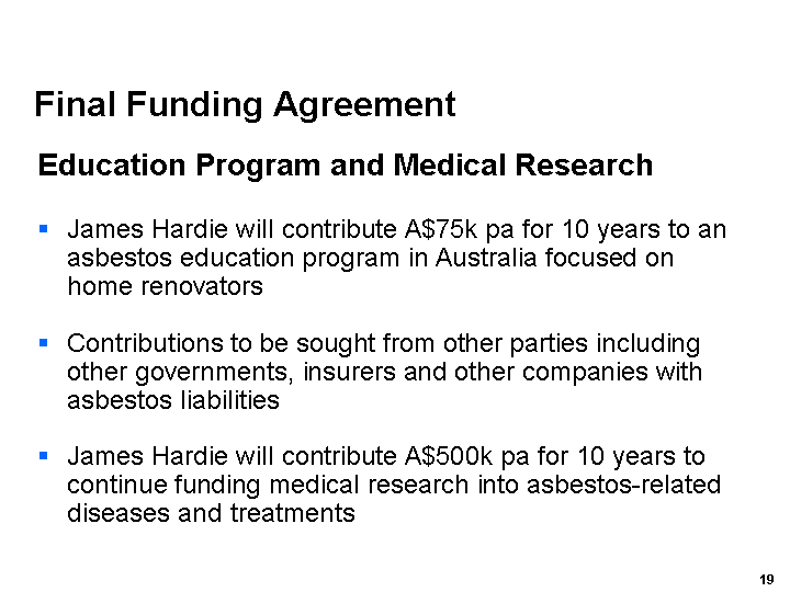 | Final Funding Agreement Education Program and Medical Research James Hardie will contribute A$75k pa for 10 years to an asbestos education program in Australia focused on home renovators Contributions to be sought from other parties including other governments, insurers and other companies with asbestos liabilities James Hardie will contribute A$500k pa for 10 years to continue funding medical research into asbestos-related diseases and treatments |