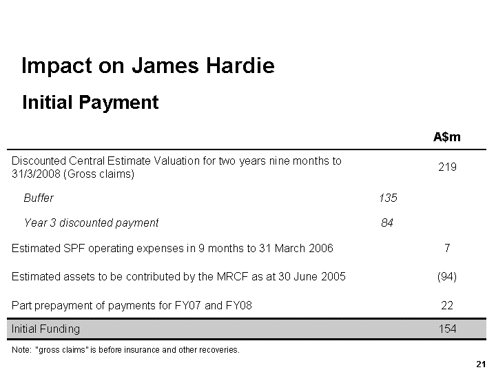 | Impact on James Hardie Initial Payment A$m Discounted Central Estimate Valuation for two years nine months to 31/3/2008 (Gross claims) 219 Buffer 135 Year 3 discounted payment 84 Estimated SPF operating expenses in 9 months to 31 March 2006 7 Estimated assets to be contributed by the MRCF as at 30 June 2005 (94) Part prepayment of payments for FY07 and FY08 22 Initial Funding 154 Note: "gross claims" is before insurance and other recoveries. |