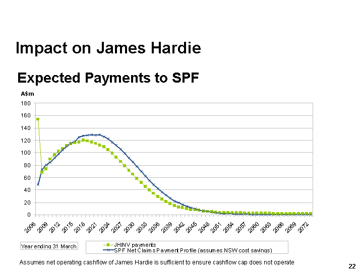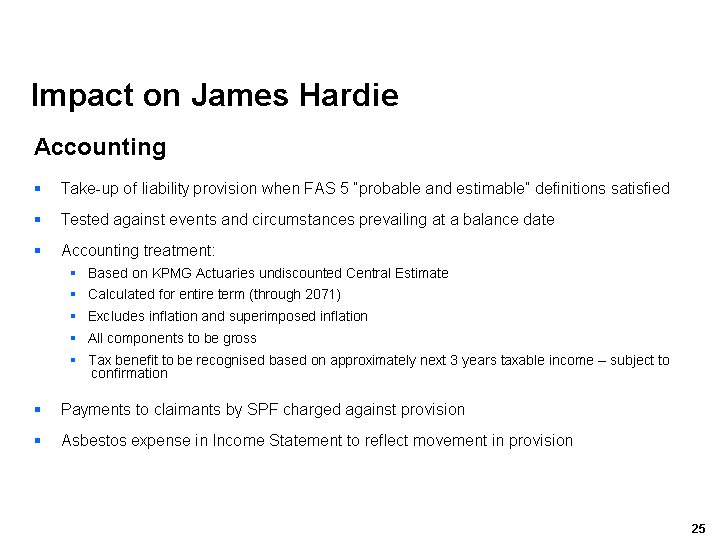 | Impact on James Hardie Accounting Take-up of liability provision when FAS 5 "probable and estimable" definitions satisfied Tested against events and circumstances prevailing at a balance date Accounting treatment: Based on KPMG Actuaries undiscounted Central Estimate Calculated for entire term (through 2071) Excludes inflation and superimposed inflation All components to be gross Tax benefit to be recognised based on approximately next 3 years taxable income - subject to confirmation Payments to claimants by SPF charged against provision Asbestos expense in Income Statement to reflect movement in provision |