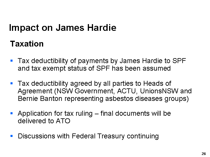 | Impact on James Hardie Taxation Tax deductibility of payments by James Hardie to SPF and tax exempt status of SPF has been assumed Tax deductibility agreed by all parties to Heads of Agreement (NSW Government, ACTU, UnionsNSW and Bernie Banton representing asbestos diseases groups) Application for tax ruling - final documents will be delivered to ATO Discussions with Federal Treasury continuing |
